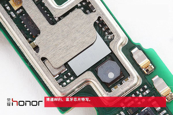 图为荣耀6内部主板上集成的博通Wifi以及蓝夜芯片特写。