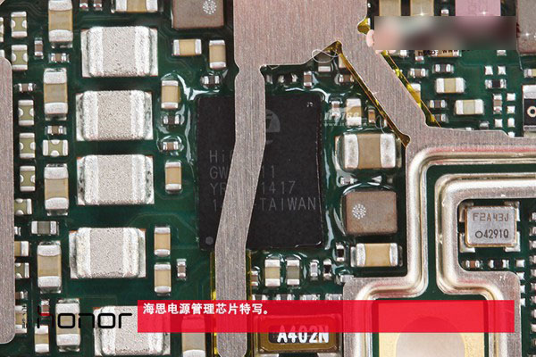 图为华为荣耀6采用的海思Hi6561电源管理芯片特写。