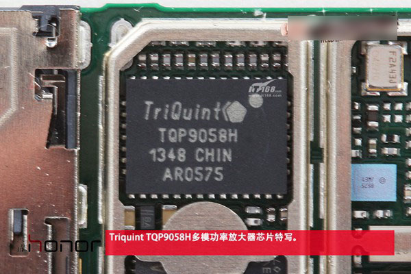 图为荣耀6主板内部集成的Triqint TQP9058H多模功率放大器芯片特写,如下图所示。