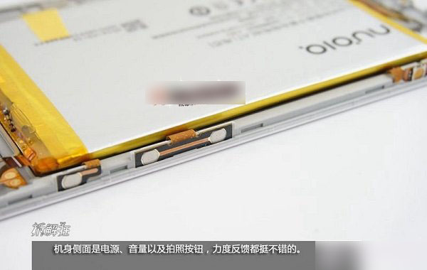 值得一看的是,努比亚X6机身面板的右侧是电源、音量以及拍照按钮,力度反馈都挺不错,这些按键均固定的机身面板上,如下图所示。