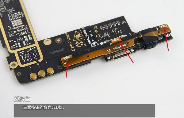 图为努比亚X6主板上的三颗屏幕底部按钮背光灯。