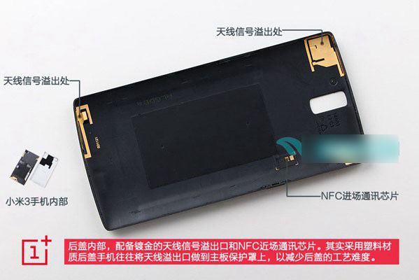 后盖内部,配备镀金的天线信号溢出口和NFC进场通讯芯片。其实采用塑料材质后盖手机往往将天线溢出口做到主板保护罩上,以减少后盖的工艺难度。
