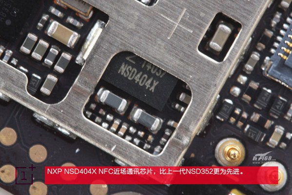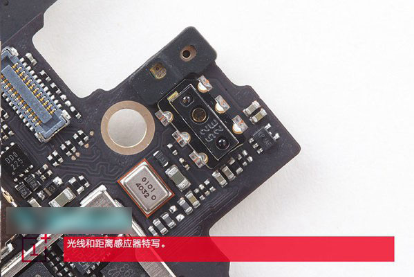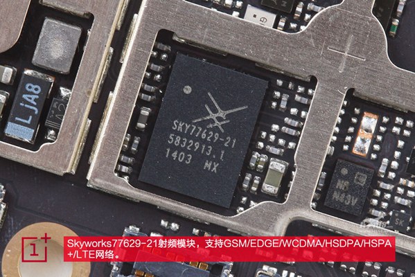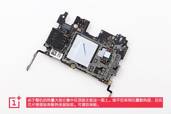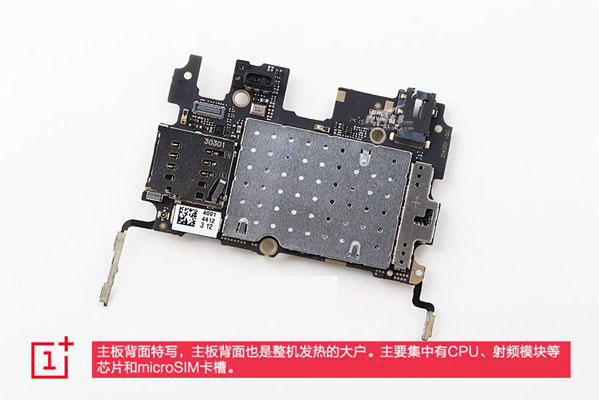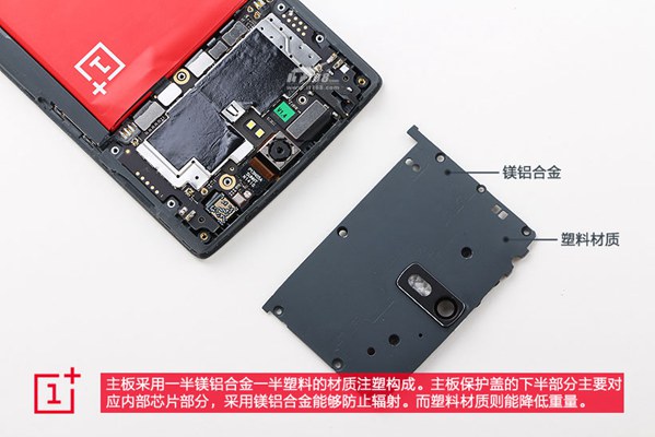 一加手机主板采用一半铝镁合金一半塑料材质注塑构成。主板保护盖的下半部分主要对应内部芯片部分,采用镁铝合金能够防止辐射。而塑料材质则能降低重量。