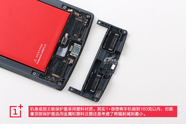 机身底部主板保护盖采用塑料材质,其实1+很想将手机做到160克以内,但就像顶部保护盖选用金属和塑料注塑还是考虑了将辐射减到最少。