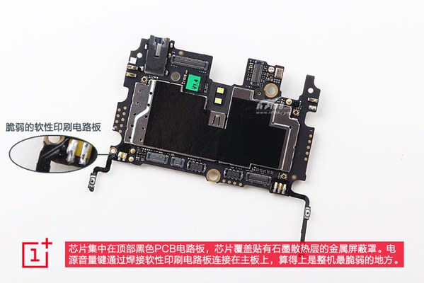 芯片集中在顶部黑色PCB电路板,芯片覆盖贴有石墨散热层的金属屏蔽罩。电源音量键通过焊接软性印刷电路板连接在主板上,算得上是整机最脆弱的地方。
