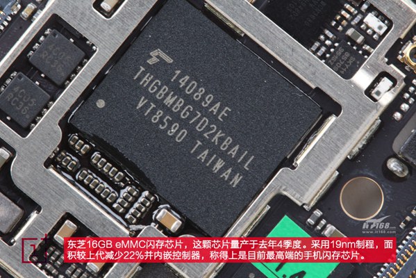 下面主要来看看主板上都搭载了哪些核心芯片吧。首先看到的是东芝16GB eMMC闪存芯片,这颗芯片量产于去年4季度.采用19nm制程,面积较上代减少22%并内嵌控制器,称得上是目前最高端的手机闪存芯片。