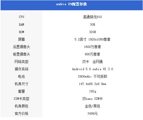 当然其结果自然不必机锋君多说,没办法打造出让人信服的无边框视觉效果,你叫什么无边框都无济于事,并且对于用户来说看多了厂商玩的文字游戏,对于无边框设计期望值也越来越低了。然而nubia Z9的出现却让整个行业都大吃一惊。4G全网通、顶级硬件配置以及让人无法自拔的无边框设计,nubia Z9瞬间成为行业的焦点。今天机锋君就为大家带来nubia Z9的体验测评。测评开始前,我们还是先来看下nubia Z9的基本配置参数: