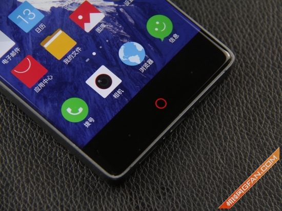 该机的底部并没有什么好说的,nubia系列经典的红色圆形Home虚拟按键依然被保留下来,同样的它依然采用了荧光材料设计并且承担了呼吸灯的作用。此外排列在Home按键两侧的分别是“菜单键”和“返回键”,有意思的是当你点击Home按键时,这两个小按键也会跟着发光,这样的设计保障用户能在黑暗中第一时间找到这三个按键。此外nubia Z9并没有采用市面上流行的任务管理按键,所以要清理后台任务,需要长按Home按键进入任务管理界面清理。