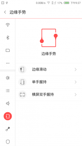 用户可以进入设置界面来进行边缘手势的设定,当然你要可以从桌面上的“边缘手势”这个图标进入。目前nubai Z9共有三张手势分别是“边缘滑动”“单手握持”“横屏双手握持”。
