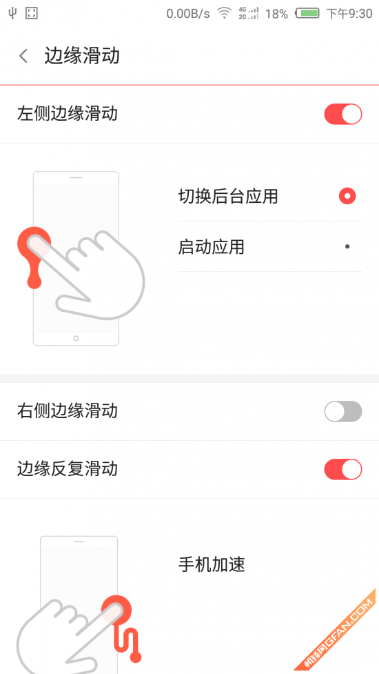第二种是边缘反复滑动,通过这种手势可以进行手机加速,也就是清理后台。要注意这种操作没有左右之分。两侧反复滑动均能实现。机锋君建议大家开启。演示如下: