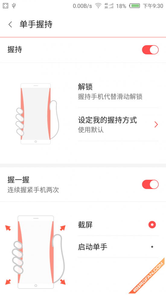 第一种是握持操作,可以进行手机解锁。但是机锋君不建议使用此选项,因为握持操作必须要点亮屏幕才行,那么屏幕我都点亮了,我为什么不滑一下解锁呢?演示如下: