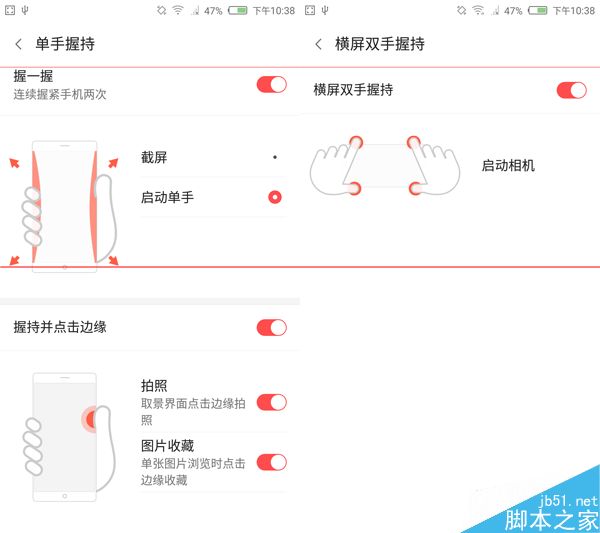 1、边缘滑动中可以提供左侧及右侧外边缘的滑动,可以用来切换后台应用或是启动应用。如果在边缘一侧反复滑动的话能实现手机一键加速的功能。双边对称式滑动则用来实现亮度调节以及音量调节。