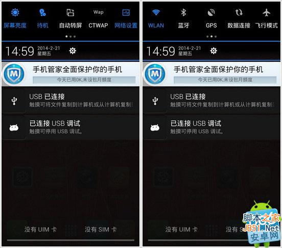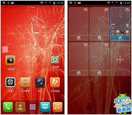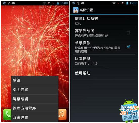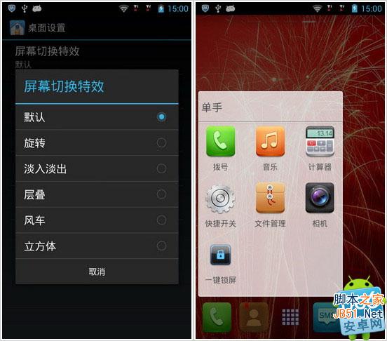 红辣椒电信版的下拉通知栏集成了大量快捷开关,使用起来比较方便,另外它也提供了一定的个性化设置功能。在主界面时,点击手机的菜单键可以打开“桌面设置”功能,除了可以进行屏幕切换特效等设定外,它还提供了一个“单手操作”的选项。这个单手操作选项打开后会在桌面出现一个快捷的开关,该开关按钮可随意移动位置,用户点击它可快速一键进入一些常用工具,在单手操作时是非常方便的。