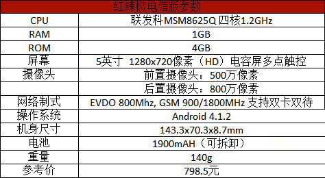 红辣椒电信版拥有5.0英寸的IPS全视角HD高清大屏,屏幕分辨率达到了720P级别。它搭载了高通骁龙MSM8625Q的四核1.2GHz处理器,拥有1GB RAM和4GB的ROM。由于要支持不同的网络制式,处理器方面采用高通芯片是其与移动版和联通版最大的区别,这款处理器为入门级芯片,属于 Snapdragon 骁龙S4 Play 系列,为Cortex A5架构,配备Adreno 203 GPU,支持 LPDDR2内存,提升的总线带宽将支持720p显示和720p编解码(包括摄录和播放),可以支持800万像素相机。