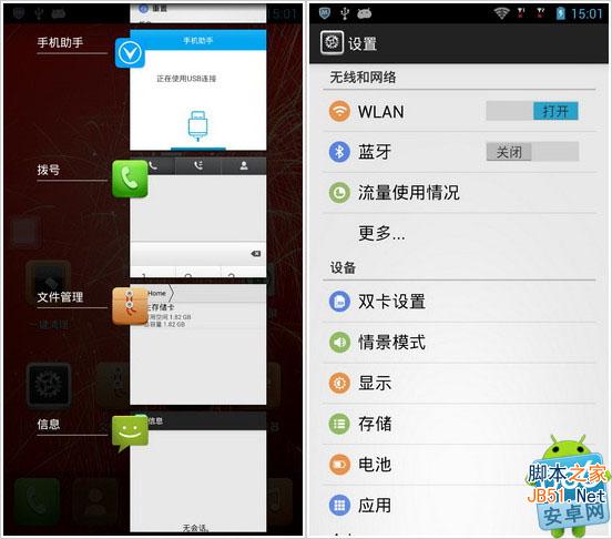 长按Home键可呼出最近任务程序,此外手机也提供了一键清理后台的功能,点击该图标就可一键完成。红辣椒电信版的整体系统体验还是非常流畅的,功能也比较人性化,而手机也提供了iLA游戏中心、iLA阅读、iLA市场等小辣椒特色应用,以便于用户查找下载娱乐、阅读、办公等相关软件。