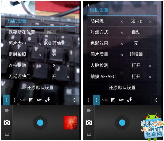 拍照功能上红辣椒电信版仍然保持了相当全面的能力。它具有正常、最佳拍照、全景拍照、HDR、人脸美化、曝光补偿、笑脸检测等七种拍摄模式,并可在设置界面对曝光、色彩效果、取景模式、白平衡等进行手动调节,也具有很好的连拍功能。它的前置摄像头像素很高,同时也具有自动美颜能力,对于喜欢自拍的妹子们来说这是非常实用和方便的功能。