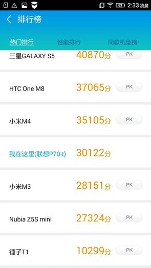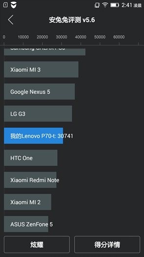 在鲁大师与安兔兔评测软件当中,联想P70的成绩都达到主流水平,对于大众用户来讲,性能还是卓卓有余的。