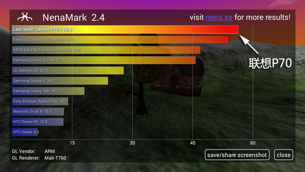 而在老牌图形测试软件NenaMark1当中,联想P70的成绩达到56.3fps,在NenaMark 2.4当中更是达到56.4fps,说明应对多数的3D应用,联想P70也是可以流畅运行的。
