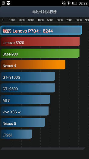 联想P70的电池容量达到4000mAh,但采用不可拆设计,经过这段时间以来的使用,总结出在正常使用强度下,联想P70可以坚持2天的续航时间,这个成绩在同级机型当中算是不错的,甚至优于不少高端机型。