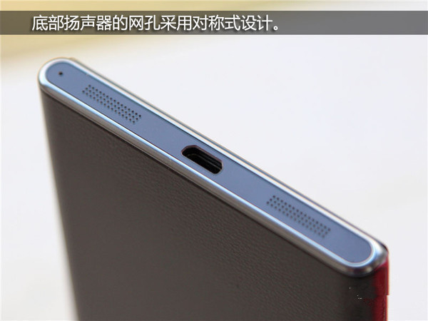 主麦克风设置在机身底部,从这里我们也可以看到扬声器采用了对称式设计,但只有左边的起真实扬声器作用,让人欣慰的是扬声器音量还是比较大的,不容易漏电话。另一方面,Micro USB接口支持OTG功能,可以连接U盘,甚至可以为其他设备充电,化身为移动电源。