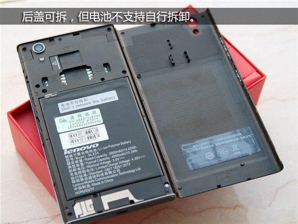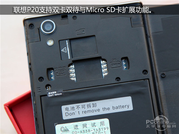 联想P70支持双卡双待功能,里面有两个SIM卡插槽,而虽然后盖可拆,但电池是不能自行更换的,电池与机身的连接部位也有封条。