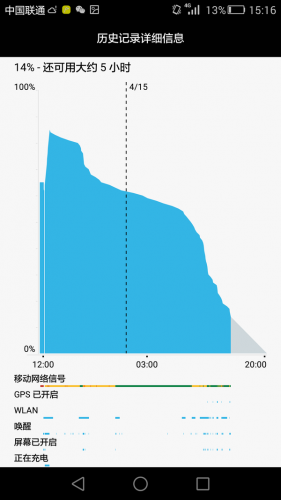 前文提到,P8支持双卡双待,不过我拿到的是移动联通双4G版本,并不支持电信,所以只好以单卡进行测试。尽管采用单卡,我还是发现P8偶尔会有一点温度在,起初我还担心会影响到续航,不过后来发现担心是多余的。从拿来时的85%到14%,使用时间计时整整一天。