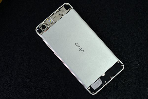 拆卸完Vivo X5上下两块盖板后,就剩下中间这款铝合金材质后盖了,其经过喷砂处理器。Vivo X5金属背盖通过螺丝和卡扣固定在机身上,因此和边框几乎没有留下什么缝隙。