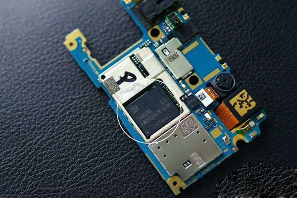 铜箔下面,是三星闪存芯片,型号为KMR8X0001M-B608,容量16GB。由于vivo X5电路板上的屏蔽罩都是直接焊接的,因此笔者没有进一步行动。