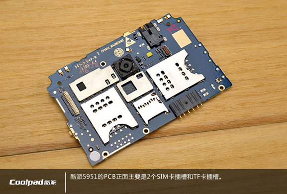 下图看到的是,我们拆解下来的酷派5951大主板的正面,主要包含两个SIM卡擦以及TF扩展存储卡槽。