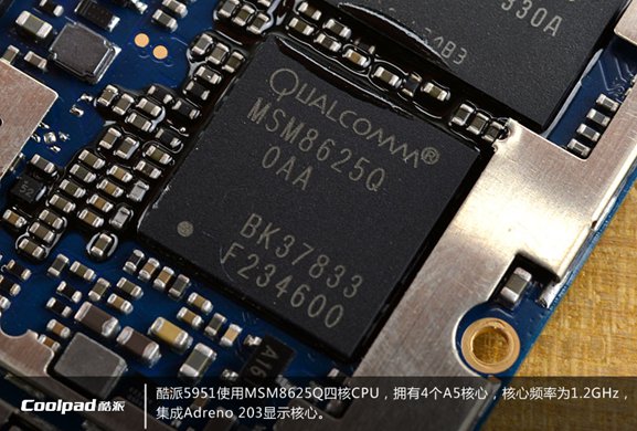 酷派5951搭载的是知名高通MSM8625Q四核处理器,拥有4个A5核心,核心频率为1.2Ghz,集成了Adreno 203显示核心。