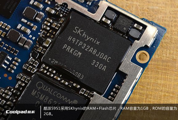 酷派5951采用看Skhynix的RAM+Flash芯片,其中RAM容量为1GB,ROM的容量为4G