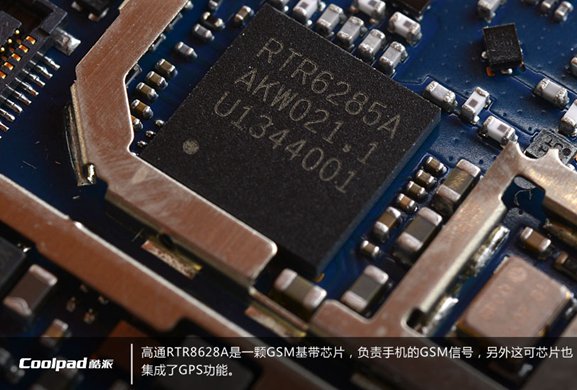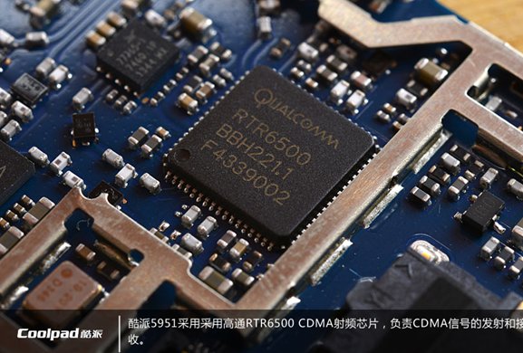酷派5951采用的是高通RTR6500 CDMA射频芯片,负责CDMA信号的法神和接收。