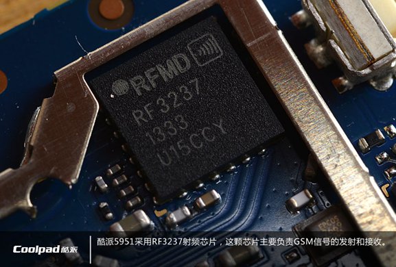 酷派5951采用RF3237射频芯片,这颗芯片主要负责GSM信号的发射和接受。