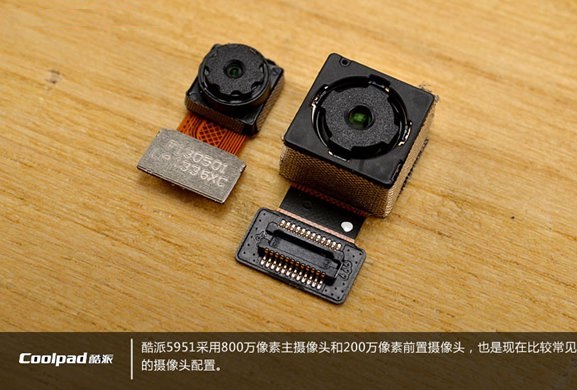 酷派5951采用了前置200万/后置800万像素摄像头,也是目前较为主流的摄像头配置,下图为拆解下来的酷派5951前后摄像头。