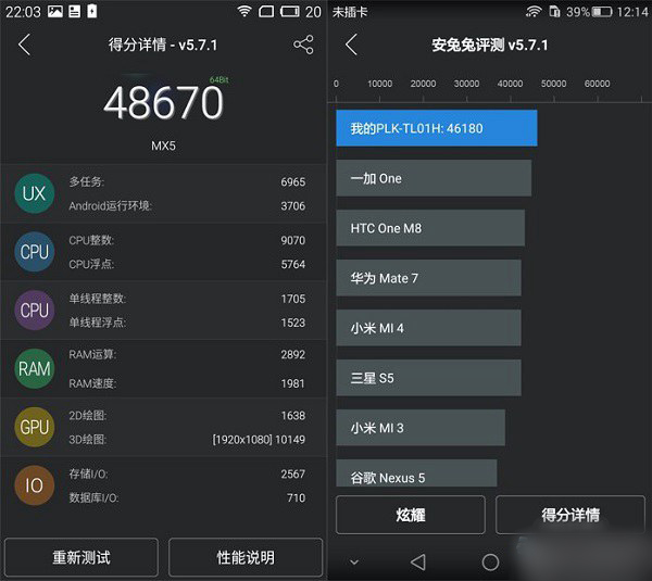 通过对比可知,魅族MX5的安兔兔评测v5.7.1的跑分为4.86万分,而华为荣耀7安兔兔评测v5.7.1的跑分为4.61万分,两者跑分仅相差2000分,性能相近,都属于时下旗舰机跑分水准。两款手机的性能运行大型游戏与应用都无压力,并且两者的散热控制也都好不错。