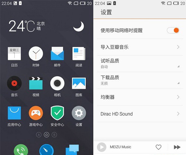 在系统功能方面,Flyme 4.5更注重内容,在音乐应用中新加入了豆瓣音乐功能,并且还内置优酷土豆视频内容,听音乐看视频很方便。此外,Flyme 4.5也已经集成了生活服务类黄页模式。