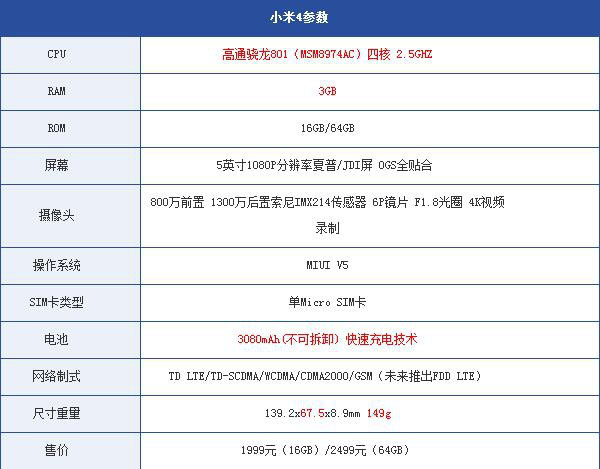 从上面总结小米4的配置:小米4搭载了高通骁龙801(MSM8974AC)四核处理器,主频为2.5GHz,运行3GB RAM内存,16/64GB存储空间。配备5英寸1080P分辨率夏普和JDI屏幕,采用OGS全贴合工艺。800万前置+1300万后置索尼堆栈式摄像头。3080mAh高容量电池,并采用2种快速充电标准,最快可2.5小时内充满。且小米4将于7月29号推出联通版3G、8月推电信版、9月推移动4G版,并保证两月内供货100万台。16GB售价依然是1999元,64B售价2499元。