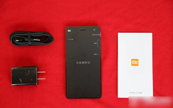 对外观评测,就从小米4外面包装开始吧,小米手机4的的包装盒与之前小米手机一样,同样采用灰褐色纸质硬盒包装。内附的配件也比较简单,一个电源适配器、一根数据线,保修卡和说明书。没有任何多余增加的附件,这也是小米手机独有的外观包装,一直延续至今。