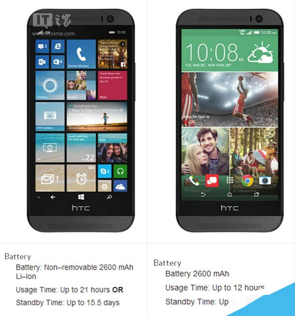 待机方面的差异也比较显著:HTC One for Windows显示15.5天,安卓版HTC One M8待机时间则为12.2天。