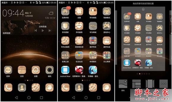 EMUI的默认主题配色较为统一和谐,以金色为主基调,图标全部经过重绘,且均为圆角矩形,这又契合了华为麦芒系列”圆润“的设计理念。