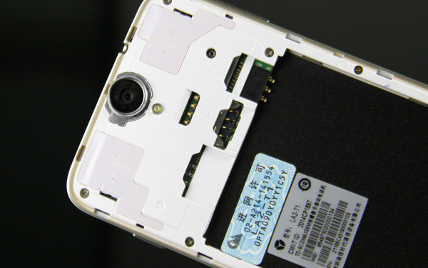 背板可拆卸,该机内置了1900毫安时电池,以及TD-SCDMA(移动版)、GSM双制式双卡槽和MicroSD卡槽。