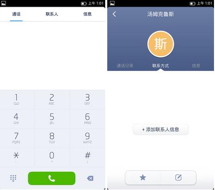 通话记录、联系人、短信功能三合一,无论你单独打开哪一个功能,都可通过左右滑动切换至另两项,当选中某个联系人时,也可以通过左右滑动查看与此人的通话、短信记录,通讯体验得到大幅优化。