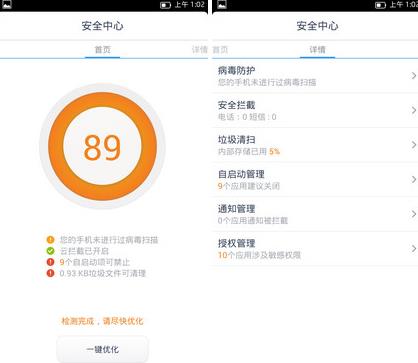 乐蛙OS5完美版基于腾讯手机管家,构建起安全中心,不仅保护手机安全和个人隐私,还可对系统进行优化加速