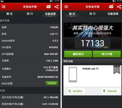 红辣椒青春版搭载联发科MT6582四核处理器和ARM MALI-400MP图形处理器,内建1GB RAM和4GB存储空间,主频为1.3GHz,17133的跑分成绩也符合千元四核机的正常水平。当然,跑分只是提供了一个量性的参考,手机的真正性能还要看最吃硬件的高清视频和3D游戏。