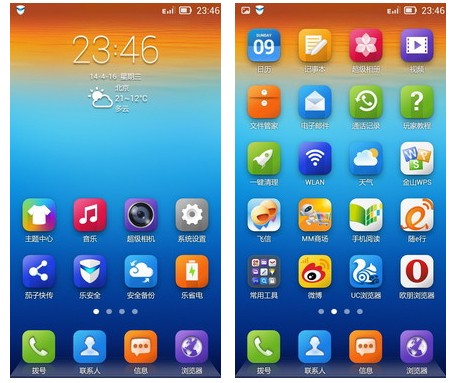 值得一提的是联想黄金斗士S8将安卓手机传统的桌面界面和应用程序列表界面融合在了一起,用户只需在桌面界面左右滑动即可查看手机中的所有应用,与iOS、MIUI风格相似,减少了用户二级菜单的操作,日常操作更加方便。至于界面图标则为圆角矩形设计,拥有一定的美感。