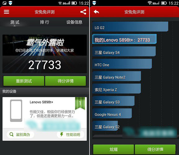 以上我们测试的是联想黄金斗士S8加特版的安兔兔跑分,其跑分成绩达到了27733分,超过了去年三星S4旗舰手机,性能在如今也是属于中高端,性能上还是非常不错的。另外普通版由于运行内存更小,因此跑分性能会略微低一些。