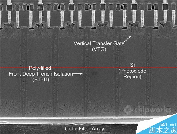下边就是三星ISCOCELL 800万像素传感器的横断面显微图,可以看到前侧深槽隔离(F-DTI)、垂直传输栅极(VTG)两个关键技术。
