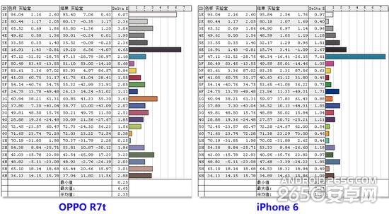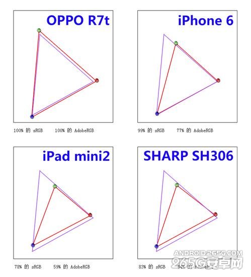 我使用Datacolor Spyder4Elite 红蜘蛛对手头的三部手机以及iPad mini2进行了测试,上图是四个屏幕的色域测试结果,OPPO R7的色域居然达到了AdobeRGB 100%,彻底秒杀其他三个屏幕,所以后面的测试我只提取了三个中最好的iPhone6来对比。