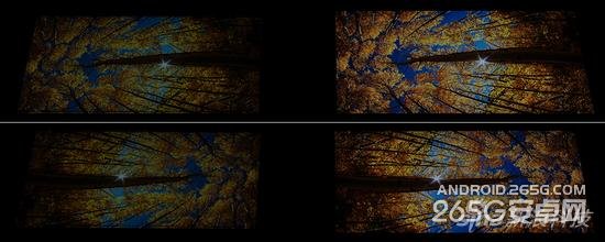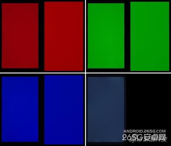 上图依次是红、绿、蓝、黑四色的对比,从对比图来看两块屏幕的蓝绿两色比较接近,而红色是R7明显更亮一点。最后一张黑色图是长时间曝光拍下的,由于AMOLED主动发光的特性,彻底杜绝了漏光之类问题,黑色画面下真的完全没法拍摄。