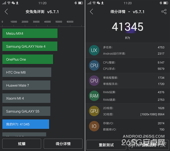 决定性能的是内存和CPU,在各家集体采用类似硬件的大环境下,类似配置的手机性能会非常接近,这里我就用主流的安兔兔做了下测试。
